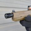 Our 9mm Micro Comps measure 0.75″ outside diameter, 0.80″ long, and 1/2-28 thread is 0.63″ deep. Our .45ACP Micro Comps measure 0.818″ outside diameter, 0.85″ long, and the 0.578″x28 thread is 0.66″ deep. Both are machined from 4140 steel, heat treated, and finished in black nitride. The 9mm Micro Comp is also available in gold (TiN) finish. Weight is just 0.62 oz (for reference an A2 spec flash hider weighs 2.20 oz and a 1/2-28 3lug adapter weighs 0.75 oz). Note that some 10mm barrels also use a .578×28 thread, and our .45ACP Micro Comps are compatible with 10mm barrels in this case.